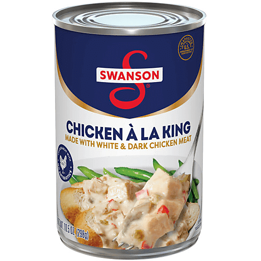 Enjoy the warm and hearty flavor of Swanson® Canned Chicken a la King With White and Dark Chicken Meat. Swanson® Chicken a la King is a convenient take on a classic comfort food, featuring tender chicken chunks and vegetables in a light, creamy sauce. Living up to Swanson's tradition of quality ingredients, our chicken breast meat contains no antibiotics, added MSG* or artificial flavors. Each single-serve, 10.5-ounce can contains 10 grams of protein for a hearty, filling addition to your entree. This easy Chicken a la King is ready in minutes from the stovetop or microwave. Enjoy it on its own or serve over a split baked potato with bacon bits, hot cooked egg noodles topped with grated Parmesan cheese, or a toasted English muffin with shredded Cheddar cheese. Take a shortcut to your favorite comfort food with Swanson® Canned Chicken a la King.